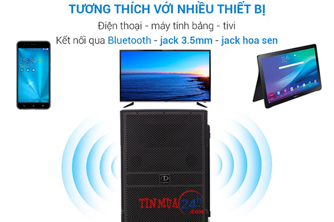 Loa kéo di động có khả năng kết nối không dây Bluetooth qua nhiều thiết bị khác nhau như Smartphone hay máy tính bảng hiện đại, thiết bị USB, thẻ nhớ SD. Ngoài ra, loa có thể kết nối với tivi qua cổng HDMI hay jack hoa sen đều rất đơn giản.